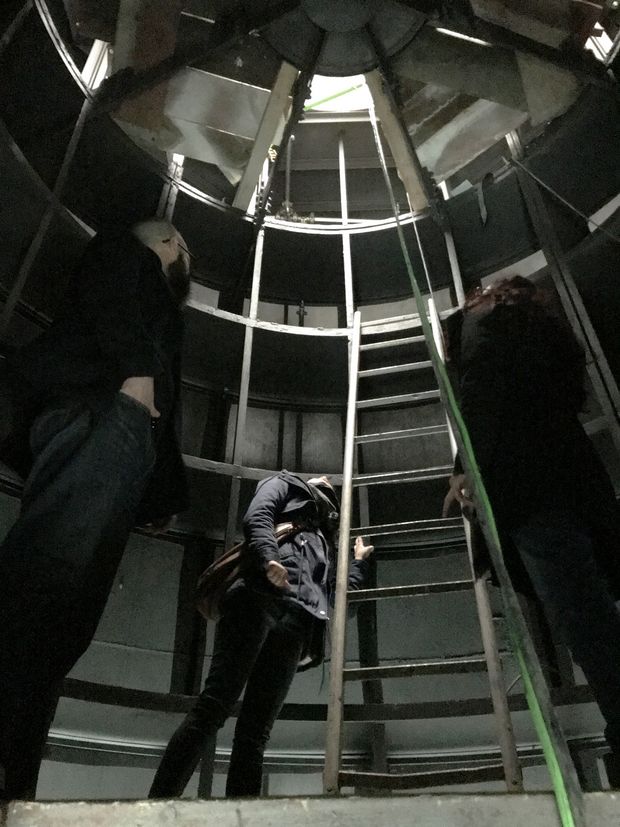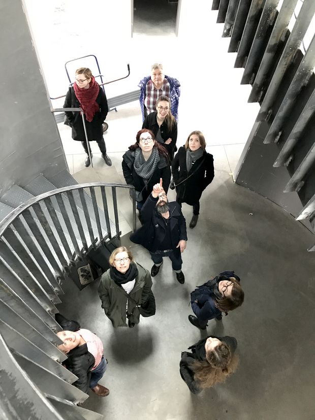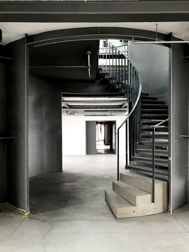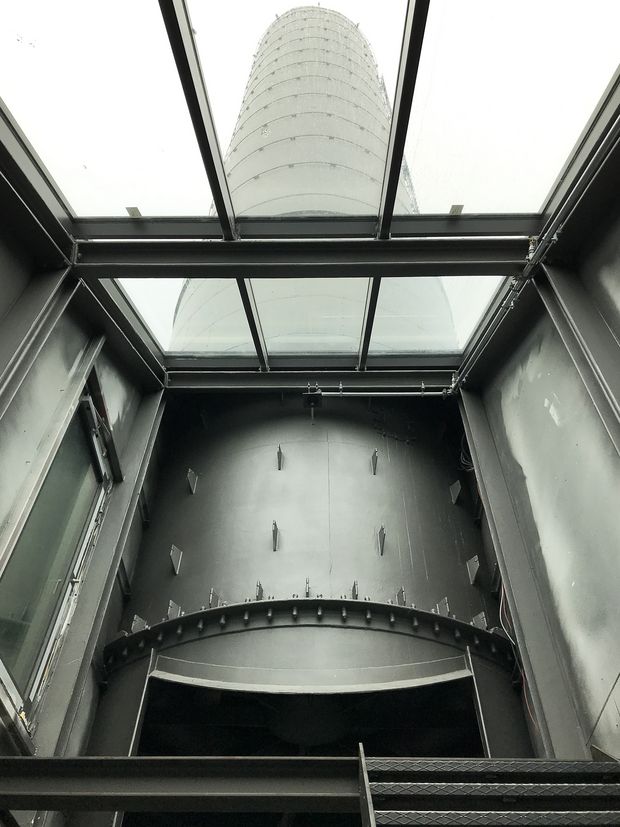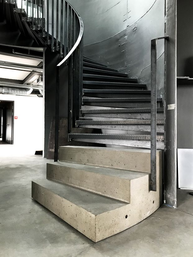 Das Besondere am 11. Obergeschoss aber sind zweifelsohne die beiden Schornsteine, die in die Flächen integriert werden mussten. Eine skulpturale Stahl-Wendeltreppe führt ein Stück weit in das Innere des Schornsteins hinein. Licht erhält dieser Bereich durch schräge Dachfenster; der Blick gleitet entlang des 80 Meter hohen Schornsteins nach oben.