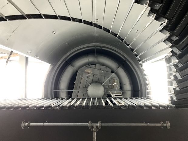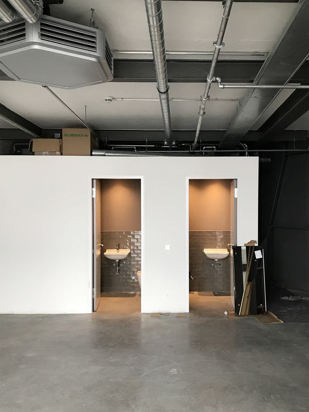 Der wesentliche konstruktive Charakter des Kraftwerks, die sichtbar belassene Stahlrahmenkonstruktion, wird auch hier fortgeführt. Die sichtbar verlegten Versorgungsleitungen und der Boden aus Estrich fügen sich wunderbar in das Gesamterscheinungsbild des Kraftwerks.