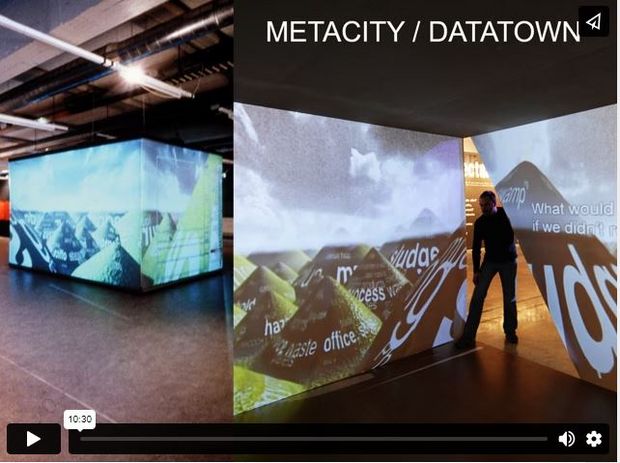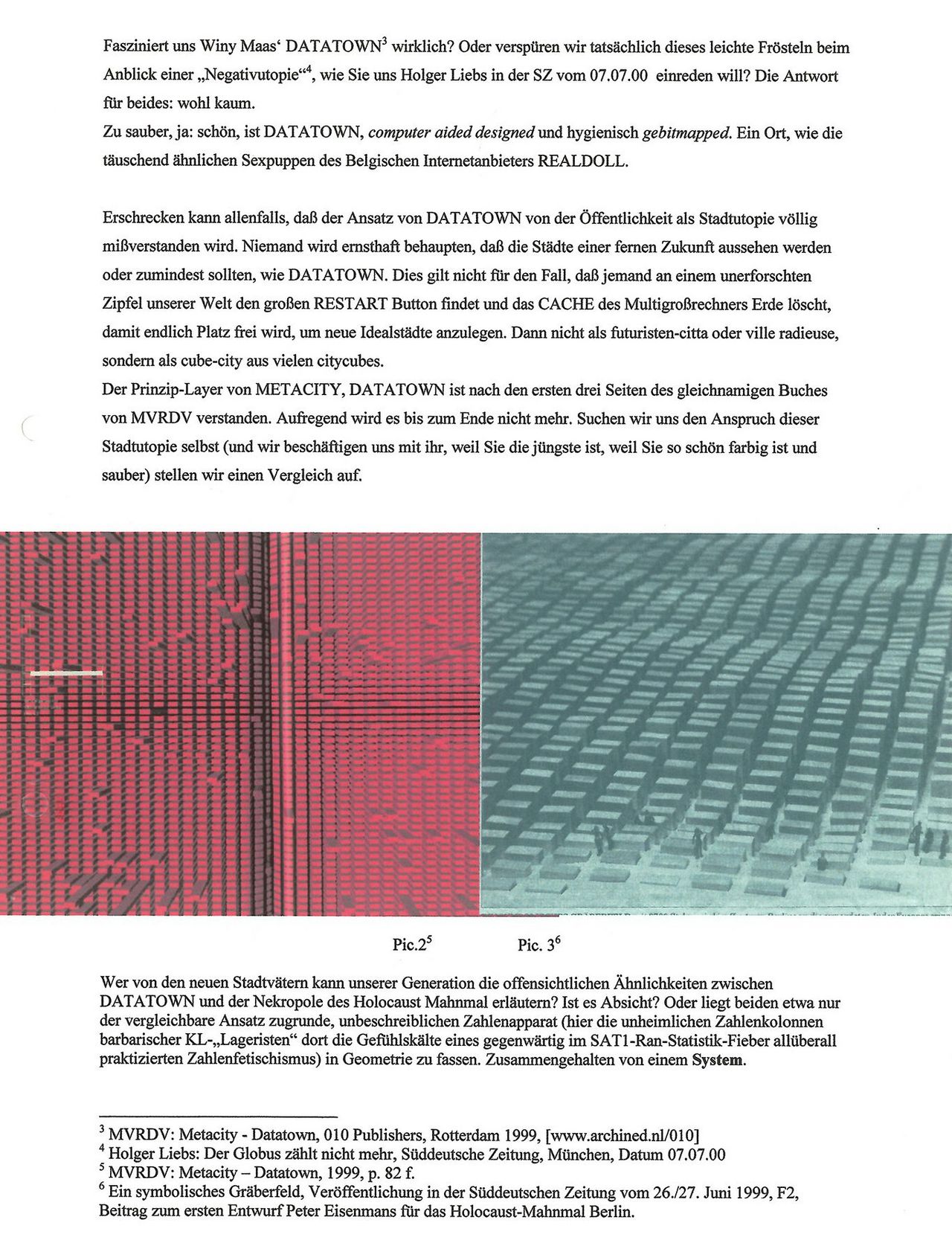 Das Prinzip "Layer" von METACITY, DATATOWN ist nach drei Seiten des gleichnamigen Buches von MVRDV entstanden. Aufregend wird es bis zum Ende nicht mehr. Suchen wir uns den Anspruch aus dieser Stadtutopie selbst (und beschäftigen wir uns mit ihr, weil sie die jüngste ist, weil sie so schön farbig ist und sauber ist) und stellen einen Vergleich auf. Wer von den Stadtvätern kann unserer Generation die offensichtlichen Ähnlichkeiten zwischen DATAWOWN und der Nekropole des Holocaust Denkmal erläutern? Ist es Absicht? Oder liegt beiden etwa nur der vergleichbare Ansatz zugrunde, unbeschreiblichen Zahlenapparat (hier die unheimlichen Zahlenkolonnen barbarischer KL-"Lageristen", dort die Gefühlskälte eines gegenwärtigen SAT1-Ran-Statistik-Fiebers allüberall praktizierter Zahlenfetischismus) in Geometrie zu fassen. Zusammengehalten von einem System.