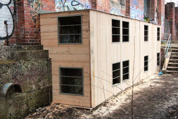 Ein großer Holzkasten und ein Betontrichter ermöglichen es den Tieren weiterhin ihr Winterquartier zu besuchen, ohne das eigentliche Gebäude durchfliegen zu müssen.