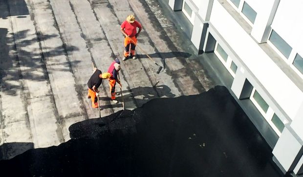 Wie gemalt! Gerade wird der Gussasphalt auf der Leinwand bzw. dem Boden verteilt. Satt und schwarz breitet er sich im Innenhof der Anlage in München Obersendling aus.