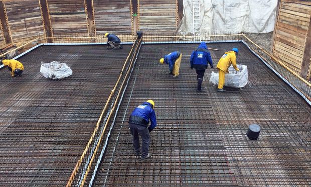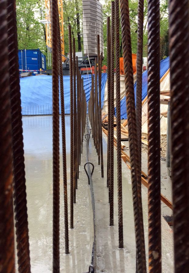 Ein Doppelhaus ist der gebaute Widerspruch: Es soll eines sein und doch zwei. Schön zu sehen hier schon bei der Bodenplatte: Ein Wald aus Bewehrung und dazwischen die Schneise, die bauphysikalische Trennung der beiden Hälften. Wir sehen hier sozusagen die Gabelung des Goetheschen Ginkgoblattes aus dem Gedicht "Ginkgo biloba"von 1815, das das Konzept einer Einheit der Zweiheit thematisiert (wenn auch nicht unbedingt im Zusammenhang mit der Baustelle eines Doppelhauses)...