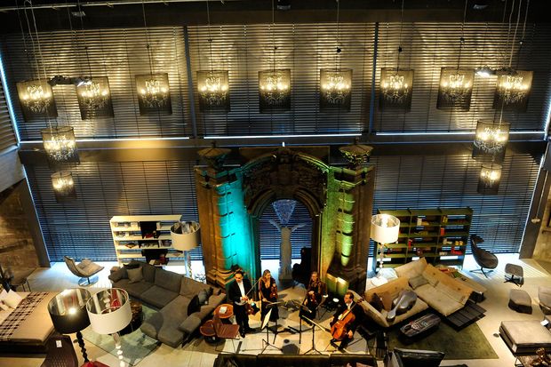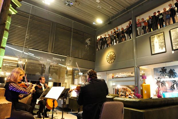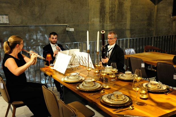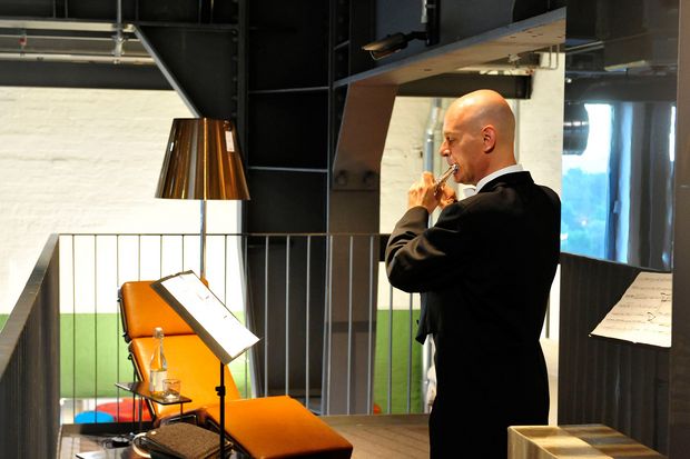 Das Besondere waren die kurzen Konzerteinlagen an verschiedenen Orten. Musiker der Münchner Philharmoniker, Streicher, Blech- und Holzbläser, spielten dabei an ungewöhnlichen Orten. An einem gedeckten Esstisch, auf einer Sofalandschaft, draußen auf der Dachterrasse und sogar aus der Krankabine des historischen Lastenkrans heraus.