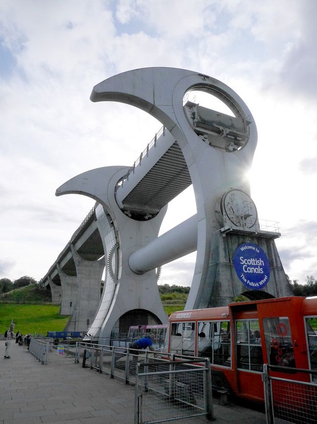 Das 2002 fertiggestellte Falkirk Wheel überwindet mit seiner weltweit einzigartigen Technik 24 Höhenmeter. Es befördert Schiffe vom "Forth and Clyde Canal" zum "Union Canal" in Richtung Edinburgh. Wie ein gigantisches Riesenrad bewegt es zwei wassergefüllten Gondeln von einer Wasserstraße zur anderen.