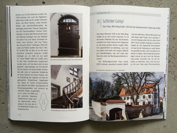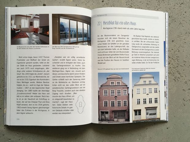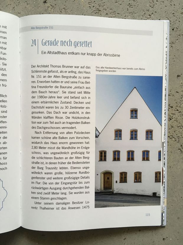 Dreißig Landshuter Häuserporträts hat die Journalisitin Rita Neumaier in diesem Buch versammelt. Dreißig spannende Berichte über Hausbesitzer, die Aufwand und Kosten nicht scheuten und in oft jahrelanger Arbeit ihre Häuser wieder herrichteten. Mitunter mussten die Hausbesitzer aber auch zu ihrem Glück gezwungen werden. Wie Karl Baier, Hotelbesitzer und Eigentümer des Handwerkerhauses in der Kramergasse 554. Eigentlich er wollte das Haus abreißen. Das Denkmalamt verweigerte die Genehmigung jedoch nach einer Untersuchung, die überraschend eine Errichtung um 1474 ergab.