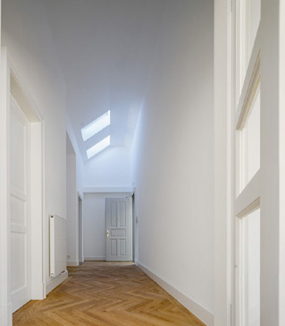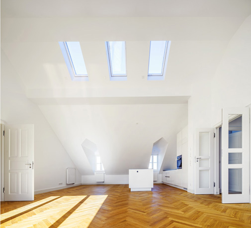 Die ausgebauten Dachgeschosswohnungen in Schwabing sind nun fast fertig. Mit einer Raumhöhe von bis zu 4 Metern sind hier großzügige und ungewöhnliche Räume geschaffen worden. Die Belichtung durch die neuen Dachfenster stellt einen aber auch vor die Frage: Wie komm ich da ran? Brauche ich eine XXL-Leiter und Absturzsicherung, um das Dachfenster nach dem Kochen mal kurz zum Lüften öffnen? Oder wie kann ich die Rollos runterlassen fürs Heimkino?