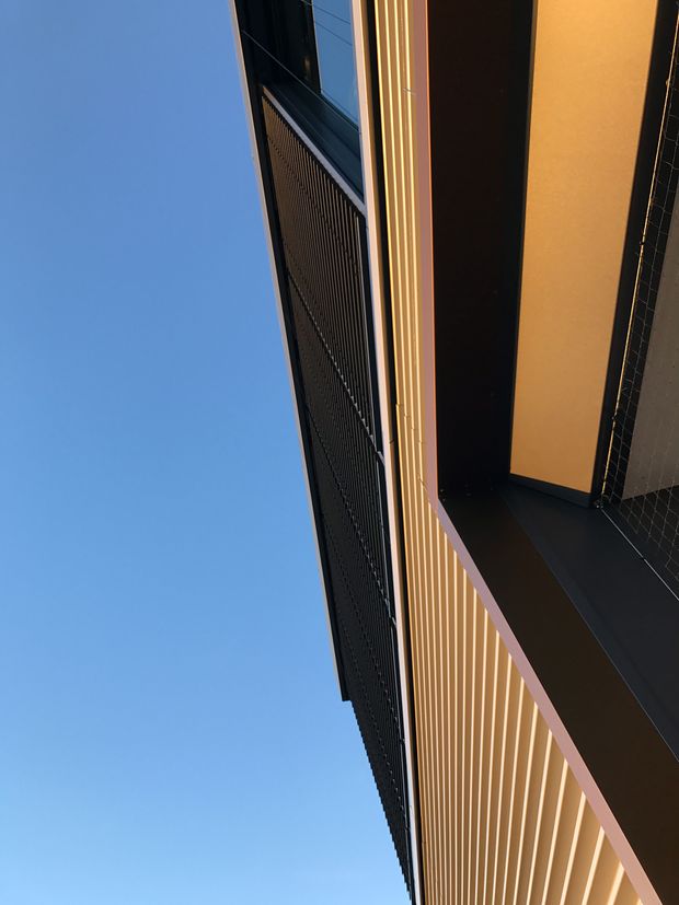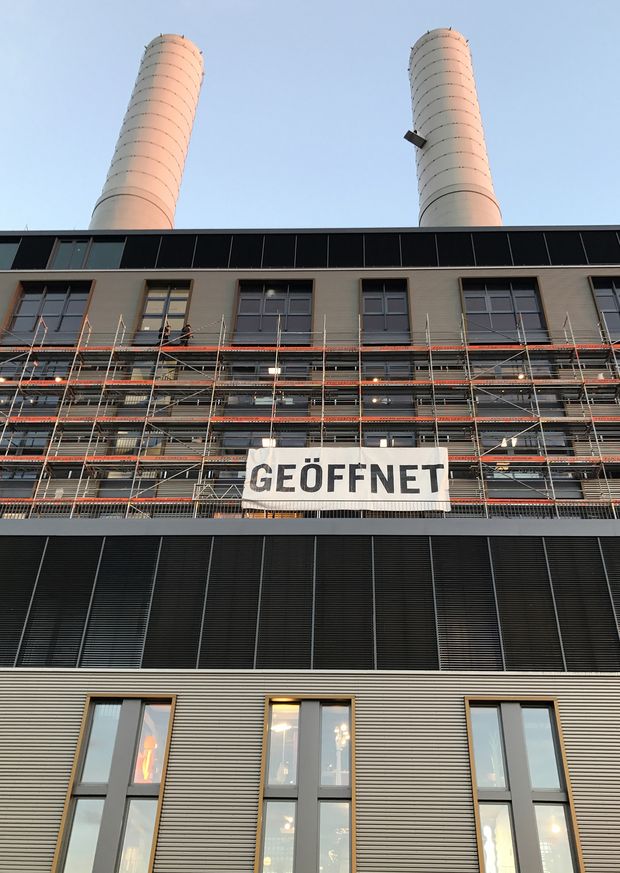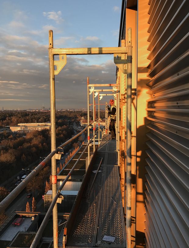 Der Abbau des Gerüstes am Kraftwerk hat begonnen. Prompt scheint dann auch die Sonne und zaubert einen wunderbar warmen Ton auf die neue Fassade aus eloxierten Aluminium.